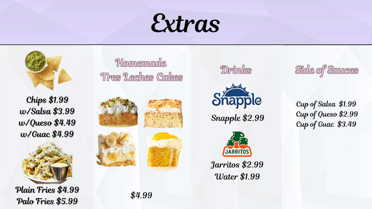 “ The owner made me a meal himself, I didn’t have high expectations coming in but he blew me away with his service with a smile. His wife creates the best cakes you would not expect at a Mexican spot, so good it should be in its own bakery. Overall 10/10 don’t know why anyone would go to chipotle when this is nearby ”